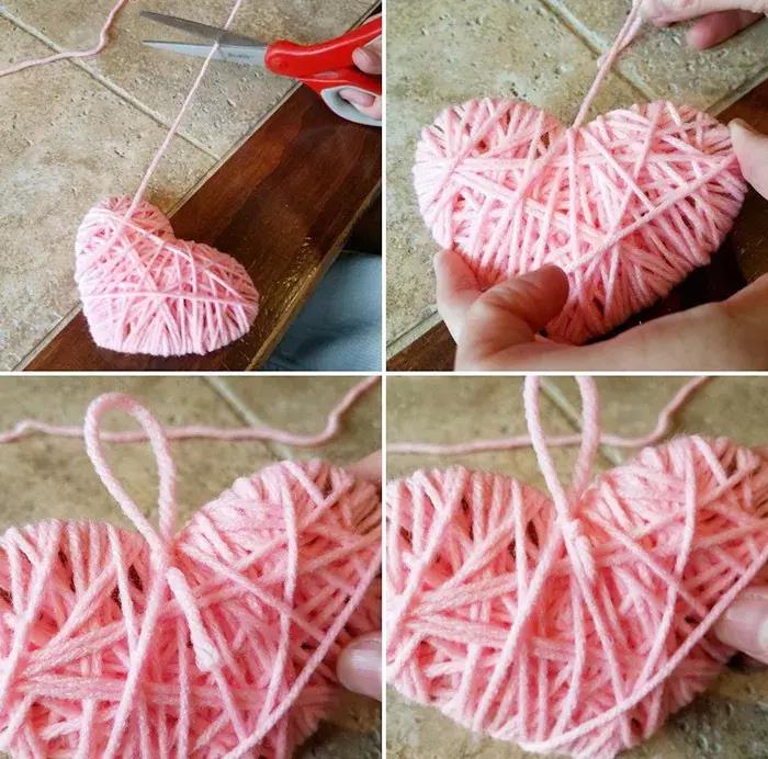 用毛线不停地在心形纸板上缠绕,注意要缠绕均匀;