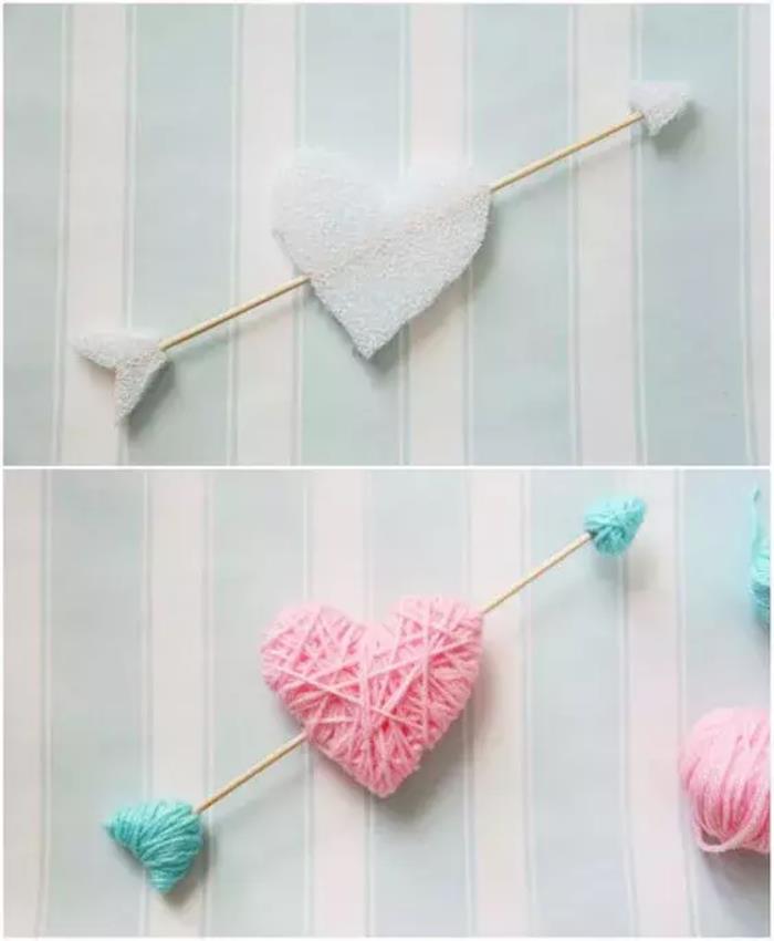 用长竹签穿过心形,在竹签两端插上箭头、箭尾形状的塑料泡沫板,之后再分别缠绕不同颜色的毛线。