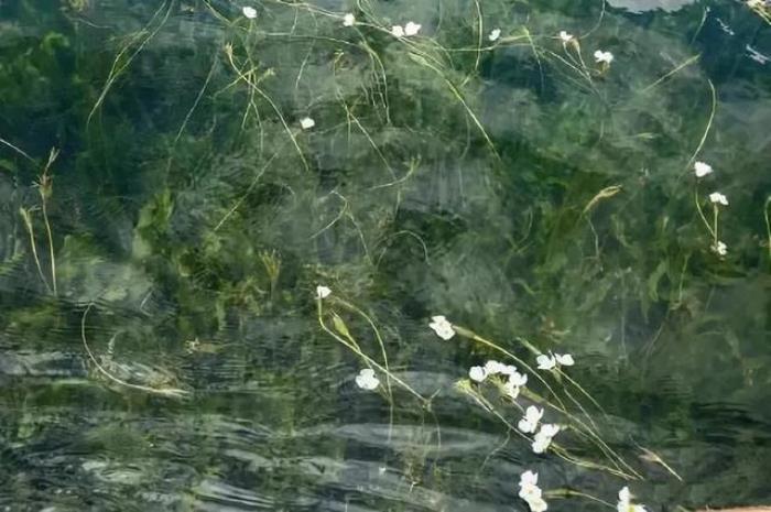清澈的湖水中点点白花随波荡漾,似繁星,似碎玉,阳光下熠熠生辉。