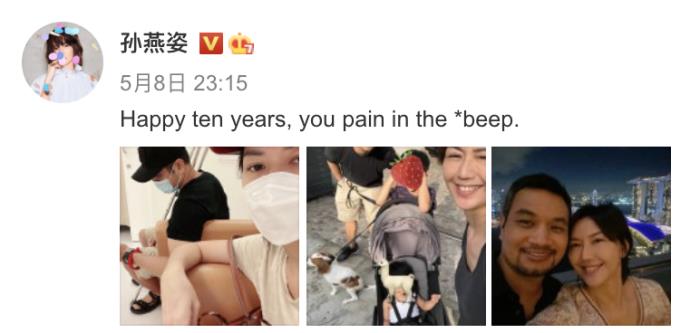 5月8日晚,孙燕姿在社交平台上罕见分享了全家福,也十分罕见地秀了一把恩爱,庆祝和丈夫结婚十周年。