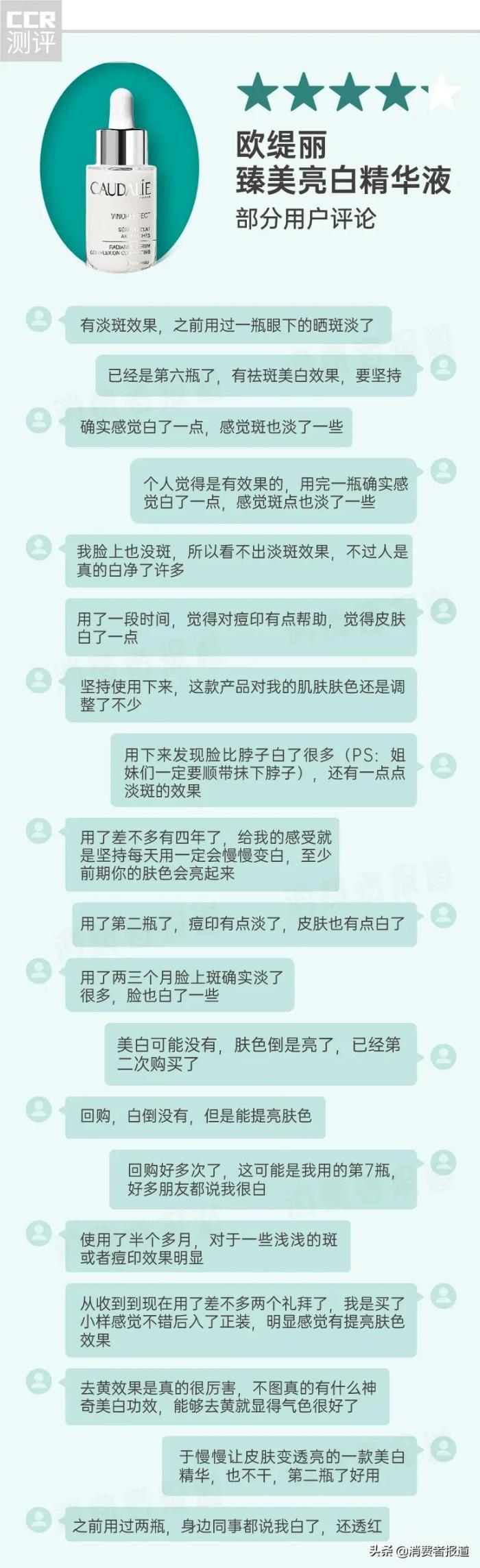亲民的价格让这款精华成为许多人美白的入门级产品,其电商评论对“提亮肤色”“变白”“去黄”方面的好评居多。