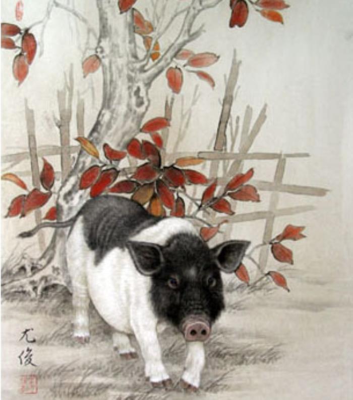 二十一点至二十三点,深夜可以听到肥猪拱槽的声音,主人很高兴。不过要想猪长得肥壮,还得起身为它添食。亥时,自然与猪相连,于是有了“亥猪”。所以,表示十二时辰的十二个字与十二生肖相结合,便有了:子鼠、丑牛、寅虎、卯兔、辰龙、巳蛇、午马、未羊、申猴、酉鸡、戌狗、亥猪这十二个组合。