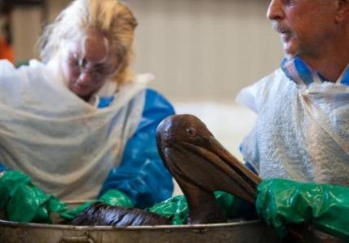 3.图中救援队正在清理了一只受漏油影响的鹈鹕。石油是宝贵的能源,但对于野生动物而言石油泄漏是一场可怕灾难。