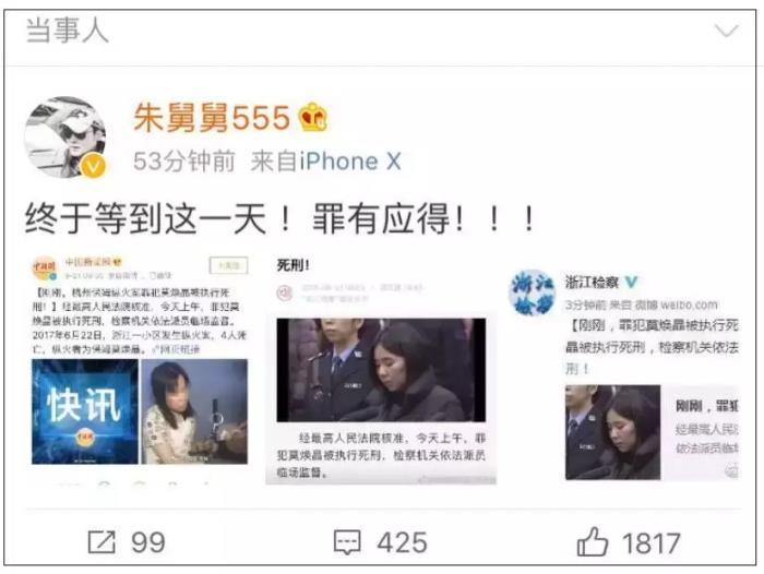 听到这个消息,我眼泪止不住的流下来。第一时间,给岳父母打了电话,我妈听着,哭了说,这一天大家都等的太久了,我也哭说,是的,恶人终于伏法。