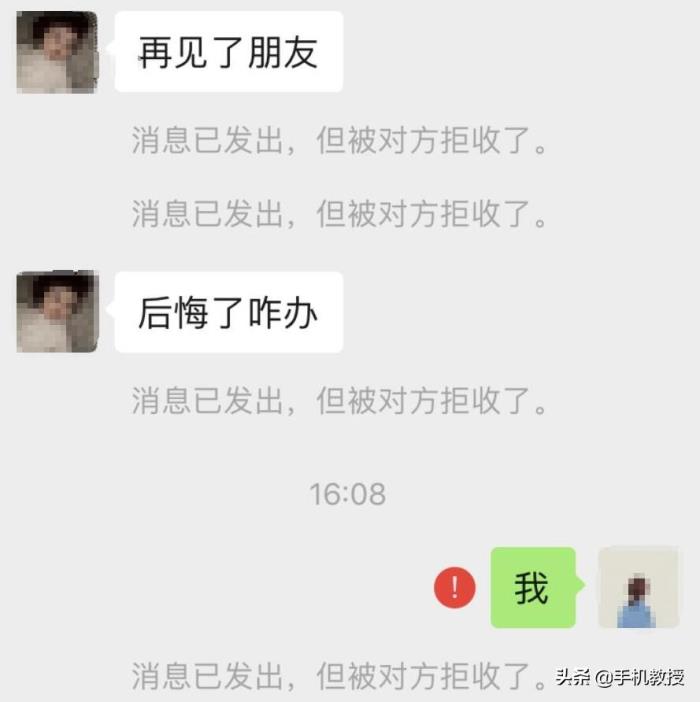 拉黑:当我们把好友拉黑之后,我们可以继续给对方发消息,对方也可以收到,但是无法发出消息,会看到令人心碎的红色感叹号,并显示“消息已发出,但被对方拒收了。”