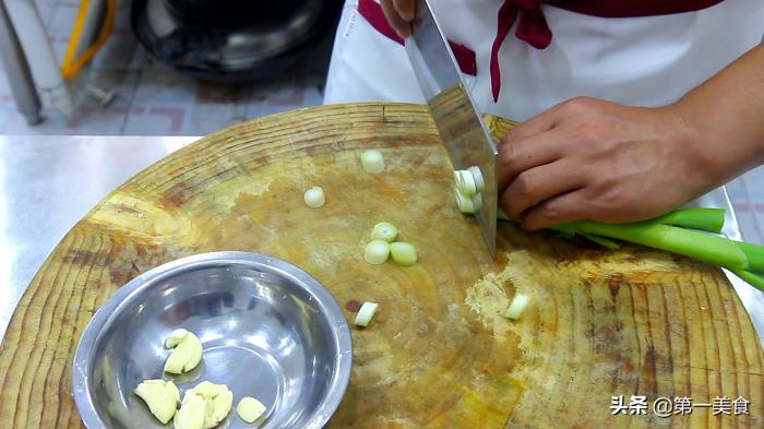 大蒜拍扁,大葱切丁,放一起备用,小葱一根,切成葱末备用。