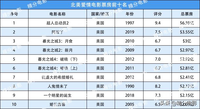 爱情是艺术创作的永恒主题之一,电影当然也不会例外。有悲情和欢喜,有离别和重逢,在好莱坞出品了众多经典爱情电影。今天,精分君整理了北美电影票房排行榜,最卖座爱情电影前10名,一起来看看吧!