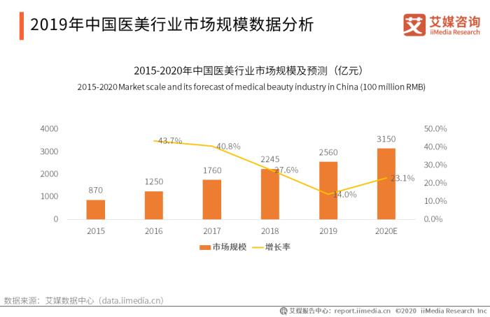 iiMedia Research(艾媒咨询)数据显示,从2015年开始,中国医美行业市场规模一直处于高速增长的态势,现在中国已经成为世界第三大医疗美容市场,预计2020年,中国医美行业规模将达到3150亿元。艾媒咨询分析师认为,虽然医美行业在中国起步相对较晚,但中国庞大的人口基数以及强大的消费能力推动医美行业在中国呈现出勃勃生机。