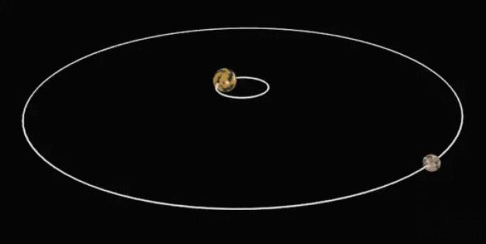 上图为冥王星和它的卫星“卡戎”的运行状态,可以看到冥王星和“卡戎”都在围绕着它们的共同质心运动,而由于冥王星的质量太小,以至于它和卫星的共同质心落在其自身的半径之外。其实地球和月球的运动状态也与之相同,只不过地球的质量比较大,所以地球和月球的共同质心位于地球的自身半径之内。