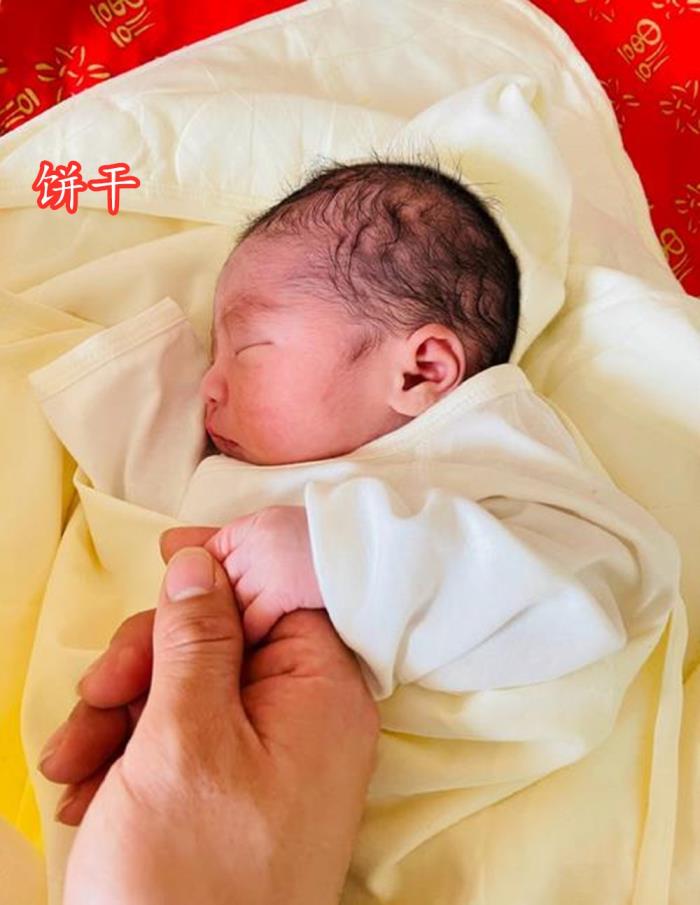饼干穿着婴儿连体衣侧卧在襁褓中,闭着眼睛酣然入睡,胎毛黝黑,眼睛闭上是一条“长线”,目测是个大眼崽,粉粉嫩嫩的,模样可爱。