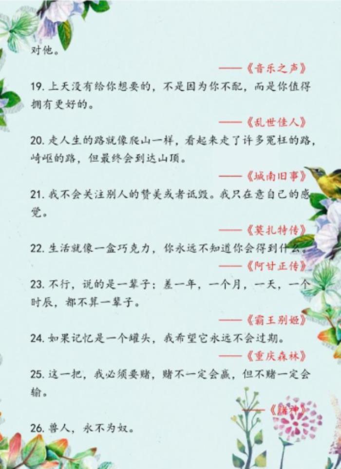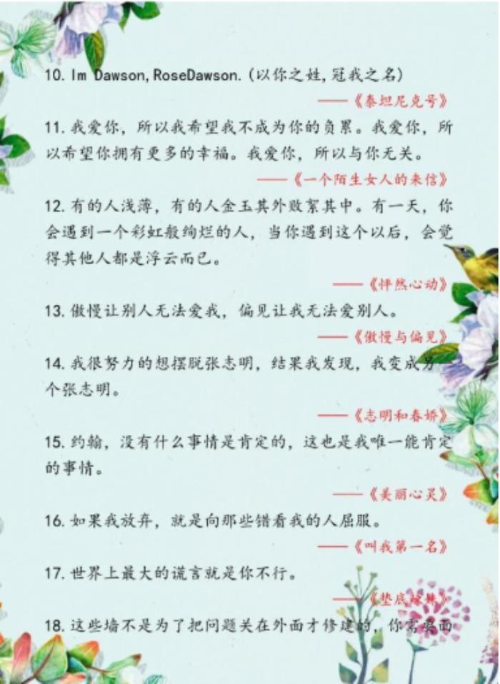 什么是捡来的素材?无非就是你阅读,看电影,听歌,看广告标语等直接收集下来的东东。比如你在书中品读到好的桥段,好的金句,好的辞藻,好的技法都是可以记录下来,等到你去创作的时候,可以修改成自己的风格语句、情节等直接用。下面老师给大家整理了一些知名电影中的经典台词,可以作为作文素材来用,让大家轻松地学到素材的使用!