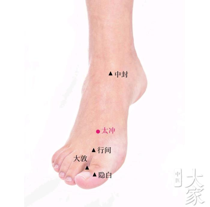 取太冲穴。用拇指点按1-3分钟,以感觉局部胀痛为宜。此穴适用于缓解焦虑引起的头痛、眩晕、胁痛、腹痛等症状。