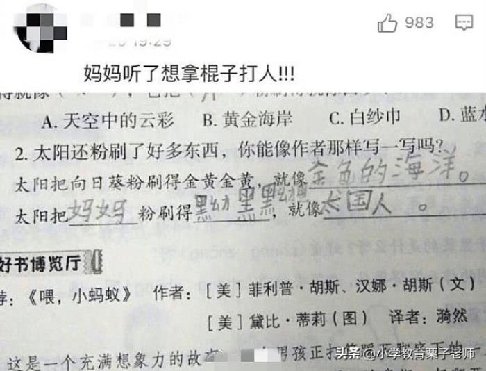 同样可爱的,还有下面这位低年级的小学生,“太阳把妈妈粉刷得黑呦呦呦,就像泰国人!”孩子啊,我保证你的妈妈看完会想拿棍子打你!