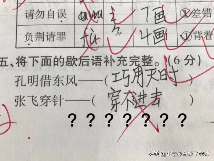 “张飞穿针——粗中有细”这一取自《三国志》的经典歇后语,是小学生,尤其是中高年级备考小升初时必学的一个知识点。大多数孩子都能写对。这个孩子竟然写出了“张飞穿针——穿不进去”!这肯定是受《三国演义》书籍和影视剧影响,“莽张飞”已经成了深入心底的人物形象了吧!