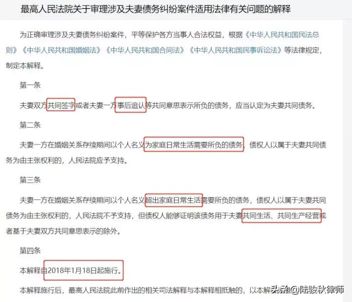 意思就是,这个司法解释施行后,对于超出家庭日常生活所负的债务,由债权人举证证明该笔债权用于夫妻共同生活或经营,无法举证的,承担不利责任。当然了,实践中,是否超出日常生活,更多是结合具体金额,毕竟通常证据有限,(债权人到哪里去打听夫妻小两口的花销去),结合当地的一般生活水准,如果金额比较低,即便没有任何证据,也有被认定为共同债务的可能性。