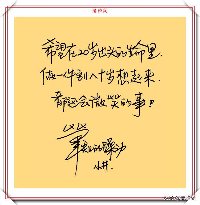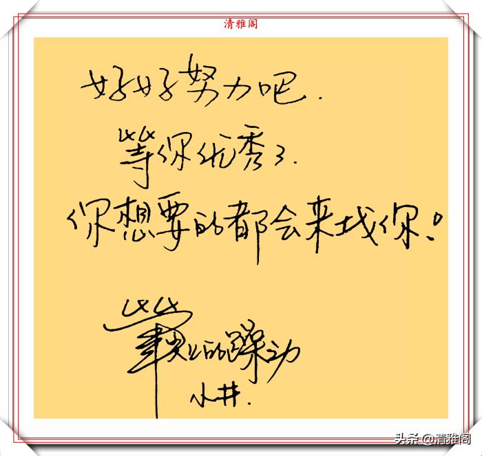 井柏然是当红的男演员,其才艺更是被观众大为点赞。然而他的字就如同他的演绎一样优秀,字体大气、个性十足、自然隽永。并且他的字还被字库收录,就书写而言井柏然的字还是不错的,比较工整,字的清晰度和辨识度都很高的。客观地说,井柏然的字并不是很独特的,却是硬笔字中有模有样的好字。虽然有很多的瑕疵,但是整体感观上不会产生审美的疲劳。就像某位网友说的:一千人心中有一千个哈雷波特,而千人前面,一千个人的字就有一千个形态。而井柏然的字恰恰代表了他的个性和书写风格。