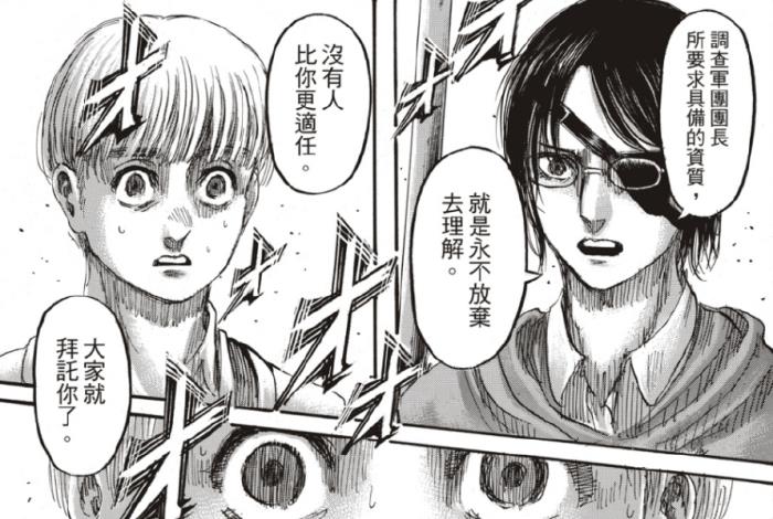 可就在这时,地鸣来了,成千上万的超大型巨人正在向韩吉所在地方前进。为了争取时间,韩吉决定留下来做个了断,她任命阿尔敏为调查军团第15任团长,韩吉对阿尔敏说道:现在利威尔是你的手下了,尽情指使他吧,大家就拜托你了!
