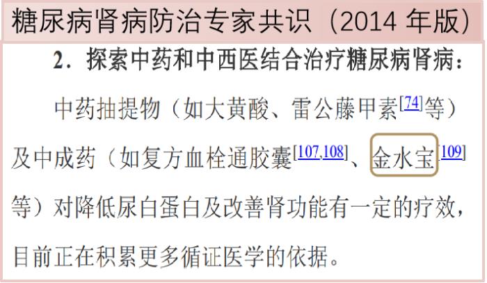 一项中国的Meta分析表明,与单独的ARB相比,金水宝联合ARB有助于降低24小时尿蛋白(24hUTP)、尿白蛋白排泄率(UAER)、尿素氮(BUN)、血清肌酐(Scr)、尿白蛋白肌酐比(ACR)和胱抑素C(Cys-C)的水平,提示金水宝对糖尿病肾病有辅助治疗作用。此外,一些其他的结果指标,包括收缩压(SBP)、舒张压(DBP)和甘油三酯(TG)在治疗后也明显下降。
