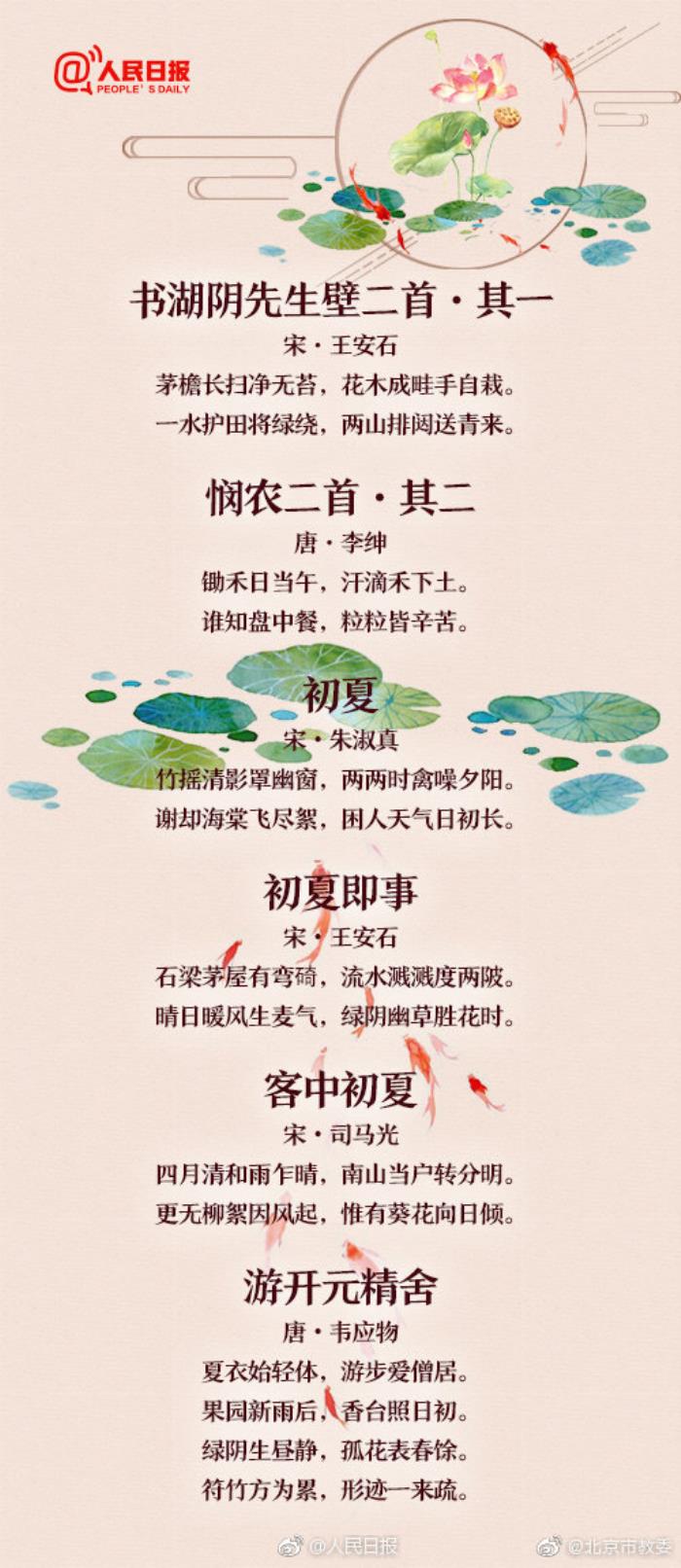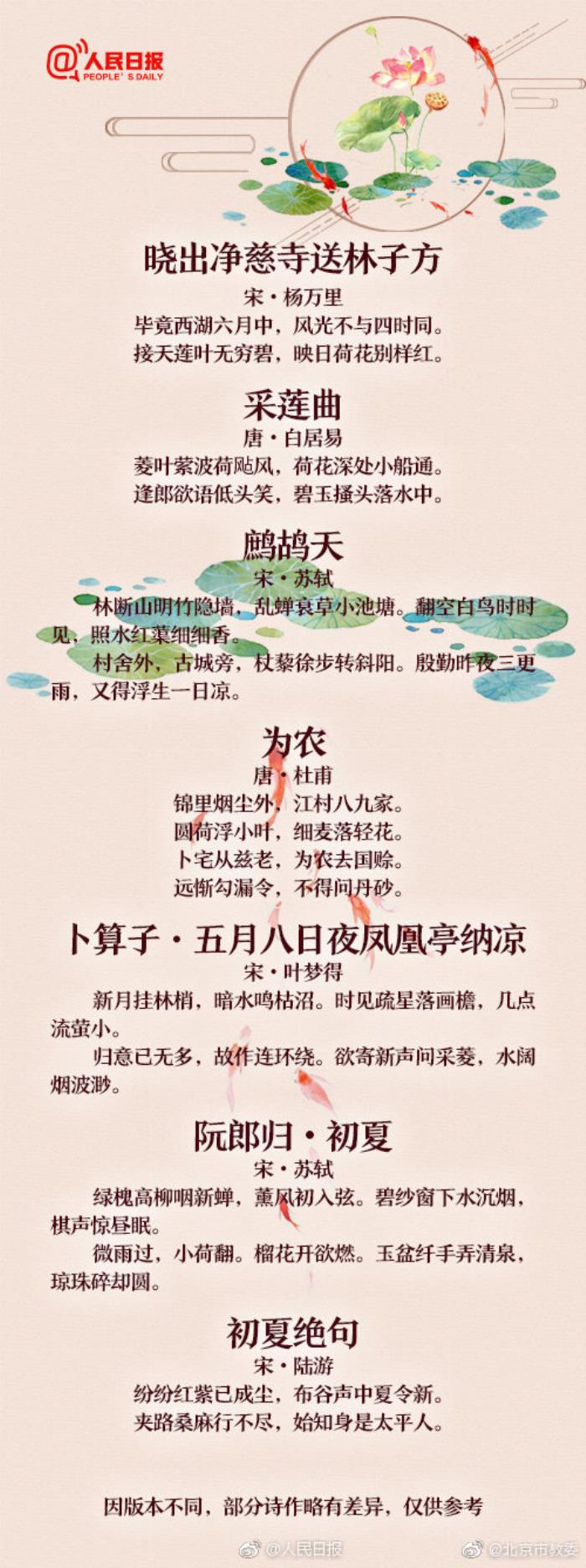 【60首描写夏天的经典诗词,让孩子学学古人笔下的夏韵!】 “小荷才露尖尖角”的生机;“接天莲叶无穷碧”的热烈;“阴阴夏木啭黄鹂”的旋律……古往今来,无数文人墨客为夏天写下了动人诗篇。“微雨过,小荷翻,榴花开欲然”,和孩子一起读读60首夏日古诗词,迎接夏天!@人民日报