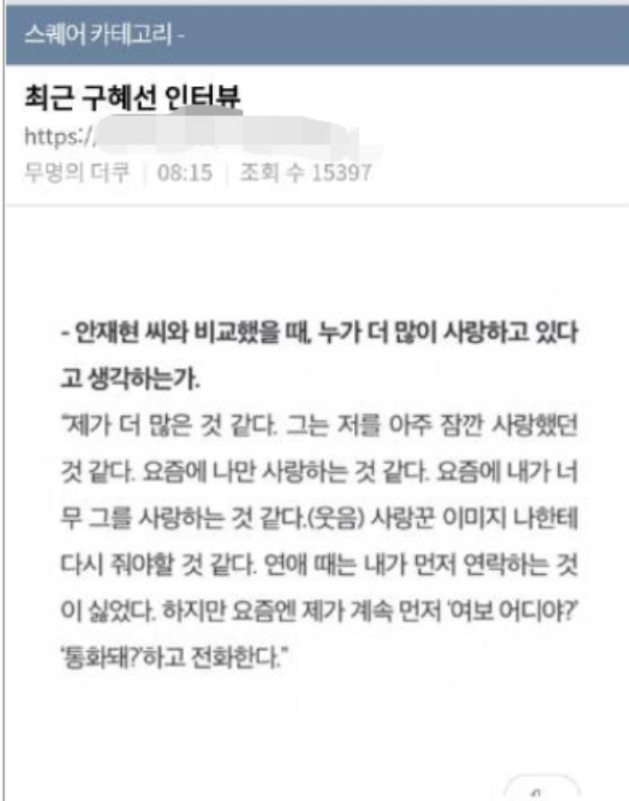 女方最近一次采访,被问到“和安宰贤比较,觉得谁爱谁多一点呢”,她还曾心酸表示“好像我爱他更多一点,他好像非常短暂的爱过我”、"最近好像只有我在爱他,最近好像我太爱他了(笑) ,得重新给我恋爱高手的印象才行了, 恋爱的时候我不喜欢先去联系他,但最近我一直先打电话问老公在哪呀?能接电话吗?"