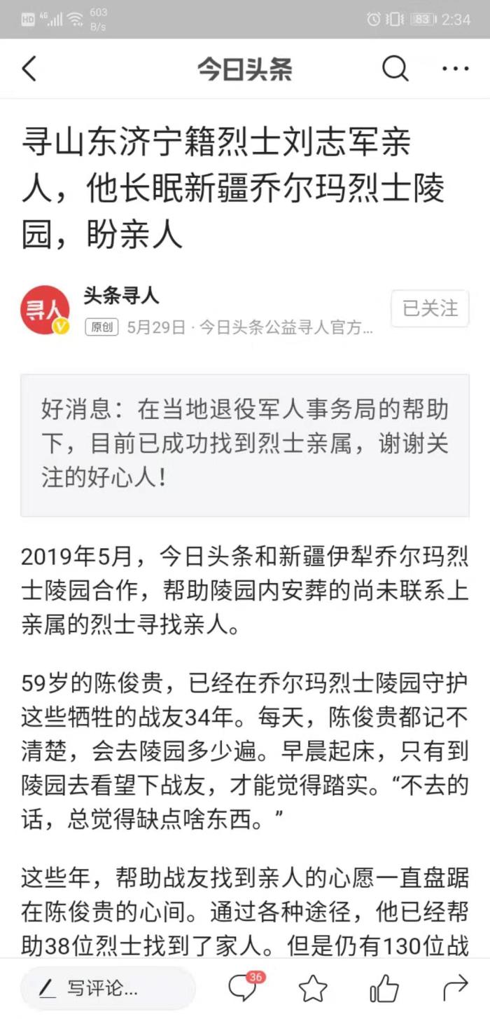 2019年5月29日,今日头条推送了一条信息——寻山东济宁籍烈士刘志军亲人,他长眠新疆乔尔玛烈士陵园,盼亲人,并弹窗到了部分济宁市的今日头条用户手机上。