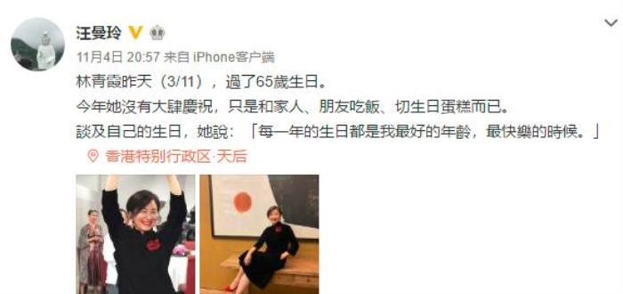 11月3日是女演员林青霞65岁生日,11月4日,其好友汪曼玲在微博晒照为其庆生,并配文称:“林青霞昨天过了65岁生日,今年她没有大肆庆祝,只是和家人朋友吃饭、切蛋糕而已。”此外,汪曼玲还透露,在谈及自己的生日时,林青霞说:“每一年生日都是我最好的年龄,最快乐的时候”,女神这种面对岁月流逝从容自然乐观的心态值得学习啊!