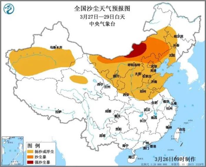 中央气象台预计3月27日至29日白天,受蒙古气旋影响,北方地区将出现大范围沙尘天气,新疆东部和南疆盆地、青海西北部、内蒙古、北京、天津等地有扬沙或浮尘天气,其中,内蒙古中西部和东南部、河北北部、北京北部、辽宁西部等地的部分地区有沙尘暴,内蒙古中部偏北地区有强沙尘暴。