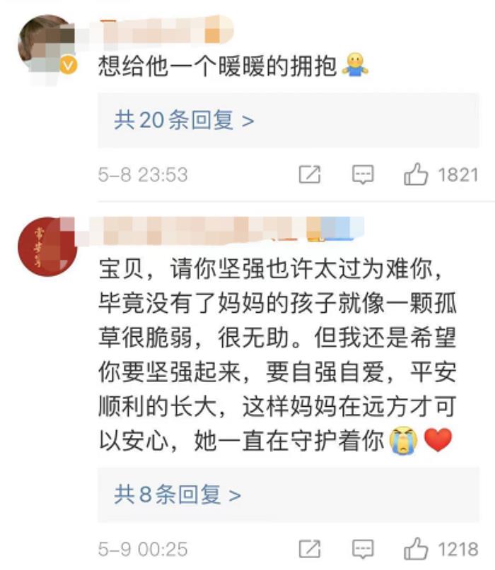 和新闻里的小朋友感同身受。十岁那年失去了妈妈,从此妈妈这个词不敢提,这个话题不敢触及。等到自己也当了妈妈,有了可爱的宝宝,好像再提这个词没那么伤心了。幸福的人用童年治愈一生,不幸的人用一生都治愈不了童年的那份缺失。感觉我内心的遗憾永远也弥补不了了。