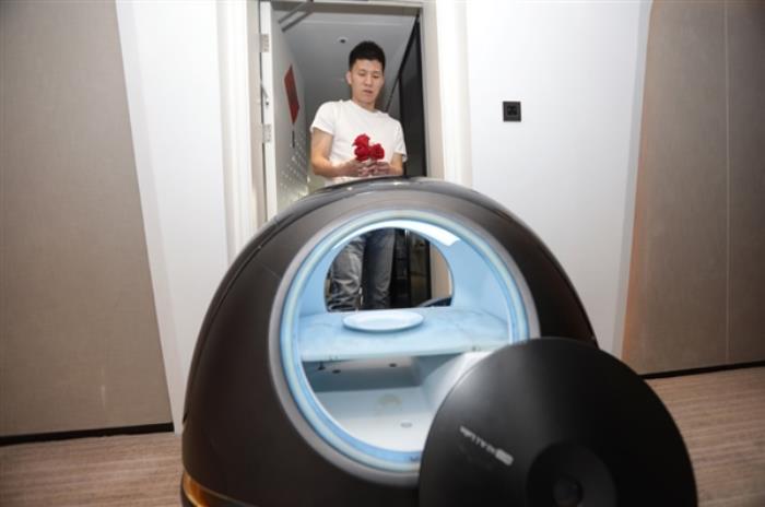 未来酒店的机器人给入住的新人送花