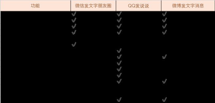 QQ可以定时发送、发送后24小时候删除;微博可以添加话题、添加照片。但是微信却没有这些复杂的功能。那是什么造成了三者功能和体验上的差异呢?