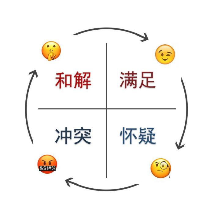 但唯一不同的是,恋爱中的争吵,对方对你尚存许多需求、期待与幻想,这份动力会把怀疑推向冲突,同时又在冲突中寻找和解的方式。而在挽回中,他放弃了推动常规循环,所以你就会一直停滞在"怀疑"和"冲突"阶段,难以和解。