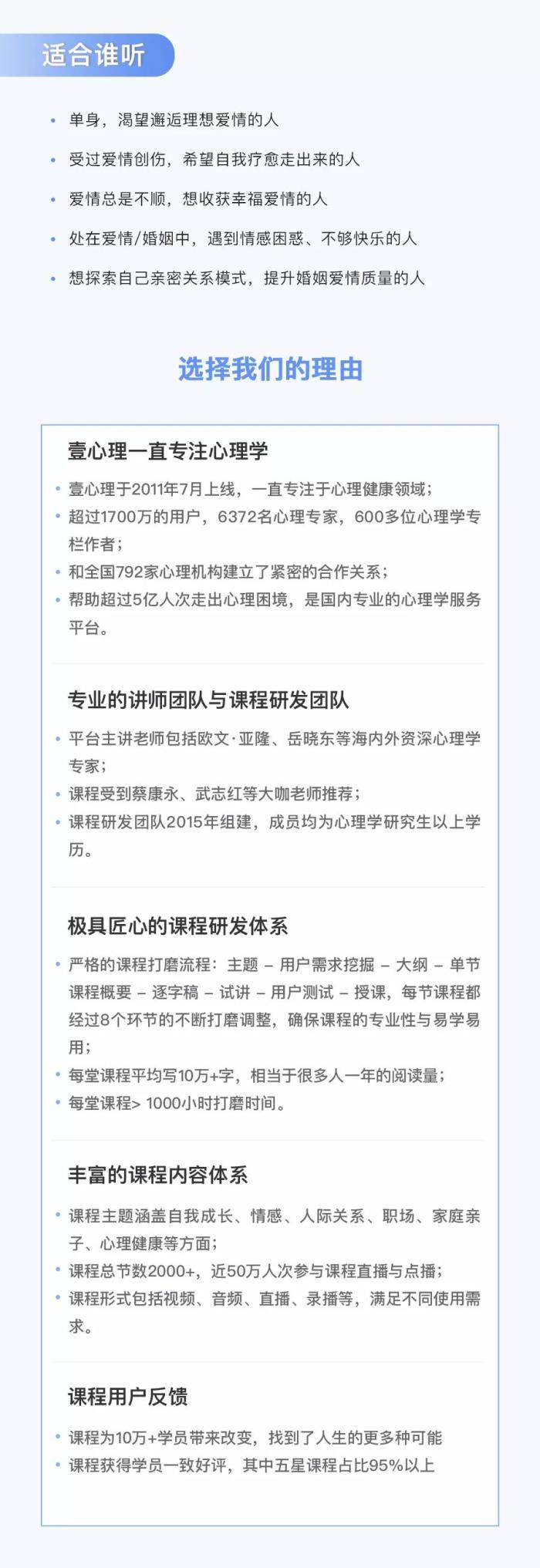 这次,《爱情保卫战》的心理专家、从事心理咨询12年的柏燕谊老师,她将把帮助上万人理清情感问题的经验,结合自身经营10年幸福爱情的心得,浓缩为《30堂爱情必修课 ,解锁幸福爱情的6种能力 》一课,帮你找到爱情最好的模样,和TA一起“一房、两人、三餐、四季”。