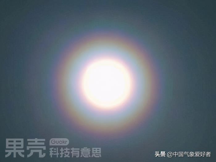 这种奇特的现象其实就是“日华”,华为一种自然光源透过薄云中的微细水滴或冰晶所产生的特殊大气光学现象。在太阳周遭形成一圈彩虹光环即为日华,而在月亮旁绕成一圈的彩虹光环即为月华。这是当光线经过带有均匀小水滴的薄云层会产生衍射现象,衍射现象在水滴旁形成新光源。新光源彼此相互干涉:光波相结合处会看到明亮的光,相抵消处的光线较暗。不同色光的由于衍射角度不同,一种色光的明亮区在另一种色光的阴暗区显现出来,渐次形成色彩次序,最后所有的干涉的共同结果是在光源周遭形成内蓝外红的彩虹光环。