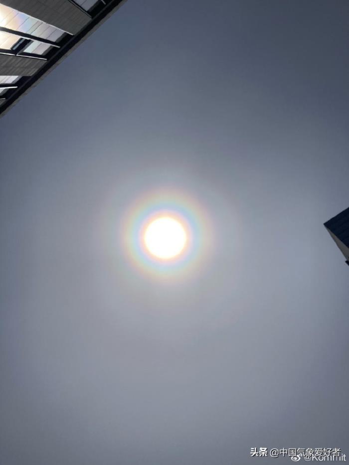 5月8日中午,今天北京虽然天气还是比较晴朗的,阳光烘烤着地面,但太阳却显得有些奇怪——据北京的网友报告称,今天中午,太阳周围出现了奇特的虹彩,像是一圈圈彩虹将太阳包围,又像是太阳戴上了帽子。但这很明显和大家熟悉的日晕又不一样,不少网友觉得奇怪:这是怎么回事?