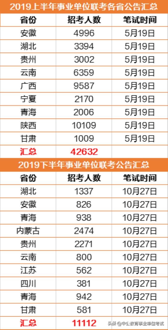 相对于参公事业单位,一般的事业单位报考条件、考试竞争比相对来说会降低很多。每年全国各省各地区都会招大量的事业单位人员,其中上下半年分别都会有一次大型事业单位联考,以2019年为例,今年上半年,有9个省份参加全国事业单位联考,共招4万多人,下半年有10个省份,共招1.1万人,机会很多,岗位诱人。