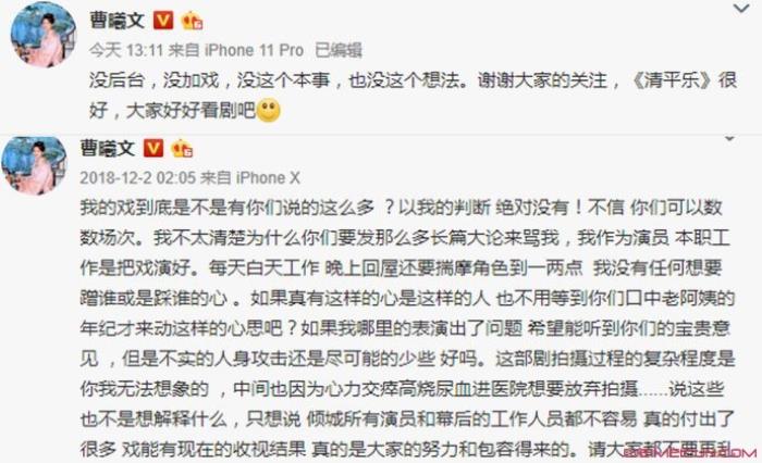 在2018年,曹曦文因出演《你和我的倾城时光》被指加戏,之后,有网友扒出,曹曦文是《你和我的倾城时光》的发行方,更是被指话语权很大,但是,曹曦文很快就对加戏一说作出回应,否认加戏。而近日,曹曦文出演《清平乐》又遭遇加戏质疑,曹曦文也否认了加戏。