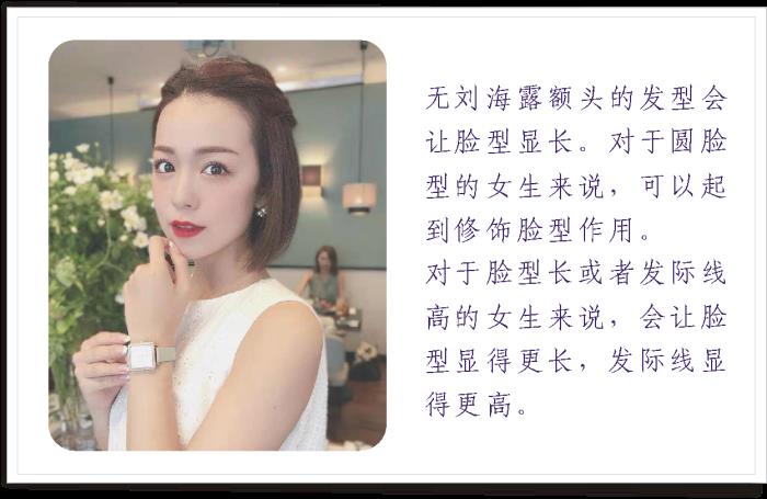 眉上短刘海或者狗啃式的刘海也不适合长脸型的女生,这种短刘海会让脸型显得更长。眉上短刘海适合偏小的脸型,可以让脸型显得圆润或者大一些。而对于大脸和长脸型的人来说,一定要三思而行。