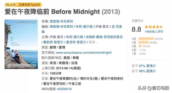 我们不得不叹服与导演的勇气和才华,以及伊桑·霍克(杰西扮演者)和朱莉·德尔佩(赛琳娜扮演者)面对长镜头依然谈笑自如的惊人演技,才为我们带来这么棒的爱情故事。