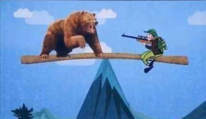 图片中,是一座山峰,山顶上有一根木条,木条的左侧坐着一只凶猛的大熊,准备扑向右侧,右侧坐着的是一位猎人,他举着枪,正瞄准大熊。