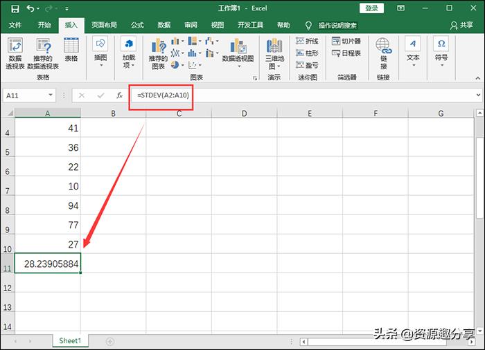 接着将函数公式补充为“=STDEV(A2:A10)”,然后点击回车就可以了。这组数据的标准差会直接显示在单元格A11中。