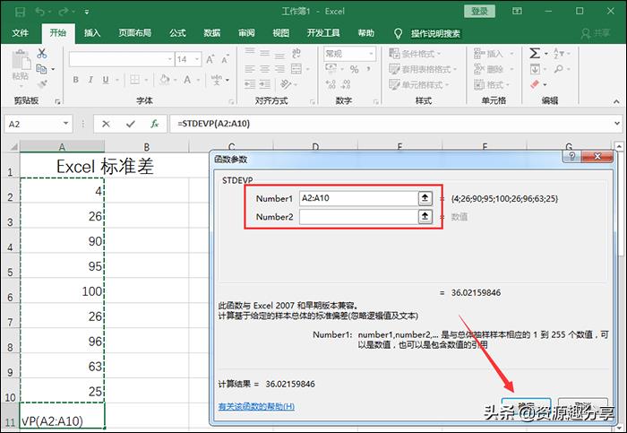 然后在“函数参数”的Number1中输入表格中需要求标准差的区域,这里我们输入A2:A10。然后点击“确定”就可以了。数据标准差会直接显示在单元格A11中。
