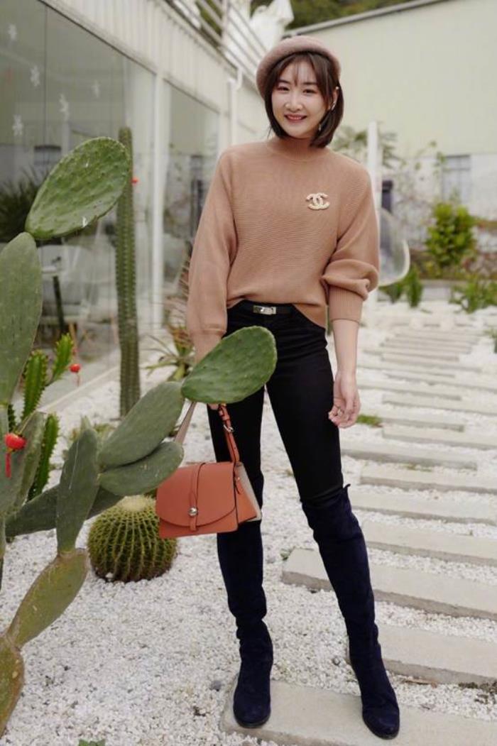 杏色半高领毛衣搭配黑色小脚裤,黑色过膝靴让鞋子与裤子完美融合在一起,让下半身更显高。摩卡色贝雷帽与焦糖色手提包与上衣作同色系搭配,尽显温柔感,香奈儿胸针作为点睛饰品,更有精致感。