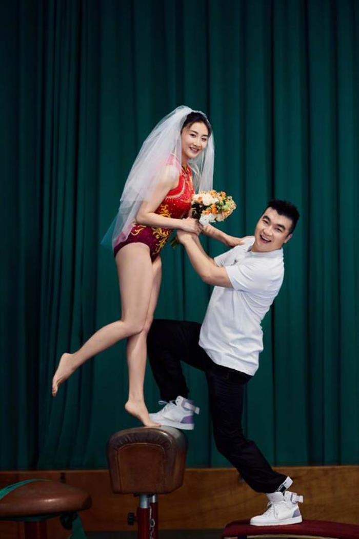 近期,奥运蹦床冠军何雯娜与丈夫梁超在节目《婚前21天》中,拍摄创意婚纱照。何雯娜身穿体操服,头戴白纱,手捧鲜花,站在体操道具上,与丈夫梁超亲密合影。