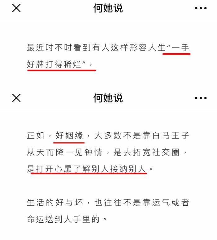 5月28日,“何她说”更新了一篇长文,洋洋洒洒数千字,从“一手好牌打得稀烂”的人生谈到了如何觅得好姻缘。