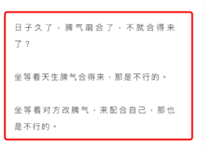 文章里写了一对平凡夫妻携手走过多年,始终非常幸福,末了感叹道,夫妻之间要想合得来,需要磨合脾气,坐等对方改脾气来配合自己,是不行的。