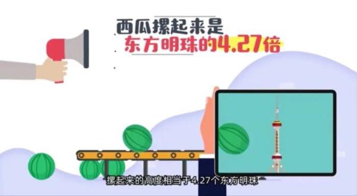 按照一个西瓜直径二十厘米计算的话,上海人五一期间吃的瓜摞起来的高度相当于4.27个东方明珠。