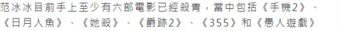 而有媒体报道称,范冰冰目前已经杀青,正在等待上映的电影至少有六部。其中包括《手机2》、《日月人鱼》、《她杀》、《爵迹2》、《355》和《愚人游戏》等。