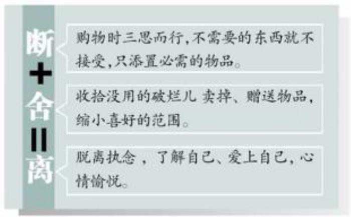 断,就是断绝不需要的东西;舍,就是舍弃多余的废物,处理掉没用的东西;离,就是脱离对物品的执念,放下对物质的迷恋。