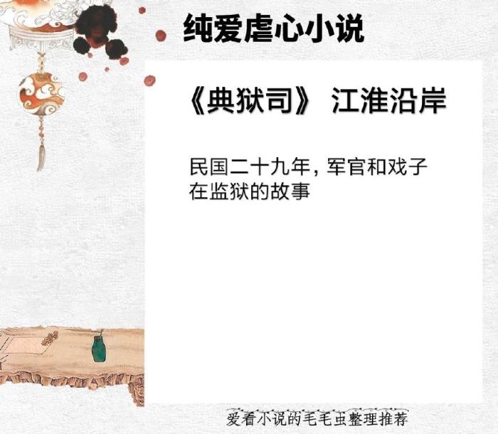 1,书名:《典狱司》 作者:江淮沿岸 小短评:监狱中的囚禁,虐的是二月红的身,虐的是张启山的心。戏子,军官,在爱情中越陷越深。书中的两个人都太高傲,固执。故至死,都没有亲口听到那一句”我爱你“。本文以多种视角叙述了这个悲情故事,其中不乏丰富的内心描写。文笔细腻,从开头虐到尾!结局哭的稀里哗啦,“张启山,你回头看看……”二月红和张启山,从折磨到相爱,最终却落得着惨局。君还记旧影里是谁人覆你衣。张启山二月红,来世没有战乱纷争,你不是军阀,你不是戏子,只做平凡人,一生两人三餐四季度余生。