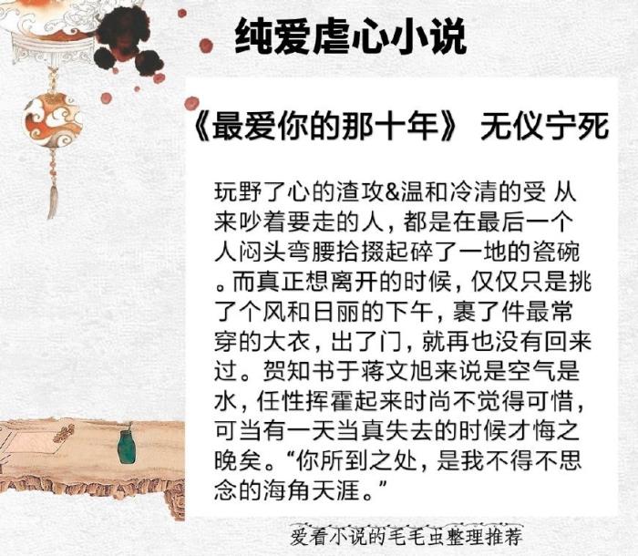 2,书名:《最爱你的那十年》 作者:无仪宁死 小短评:此文前期虐受后期虐攻,真的是看着受一点一点心如死灰再不回头,看着攻一点一点心如刀割追悔莫及,十四年感情,情到浓时情转薄,真的很唏嘘,看得我一把鼻涕一把泪!我不觉得这篇文狗血,我觉得写的有些真实,攻受是高中就在一起的,一起创业吃了很多苦,双方父母朋友也不祝福,最后熬过了七年之痒行了十年之约,也不过如此~ 这篇文最后be了,不光be还是生离死别死生不复相见的大be!‘来自南方的温柔的风,经不起北方的寒冷’最爱你的那十年,虐的很爽,是我看过的小说里be却不会让我觉得结局不好的,好像结局变成那样是意料之中,并没有那种扎心扎到很难受的情节,只是看平淡的文字就让你眼泪流到不行,不是不爱,是爱过才更显得难以接受。你会想不明白当时也是那么挚爱的一个人,对你比对自己还好的一个人,为什么后来就变了样子。 而玩弄过的感情,最终都会报应在爱的人身上…